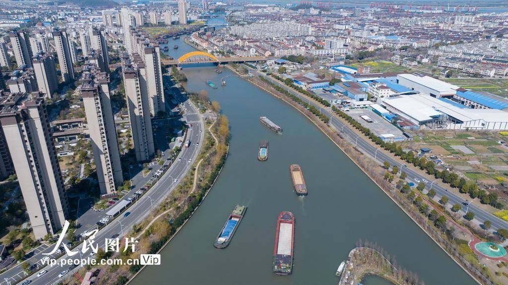 2026年3月10日,在江苏省张家港市申张线金港段河面上,满载建材、煤炭、化肥的船只正在有序通航,河道上一片繁忙运输景象。陈佳琪摄(人民图片网)