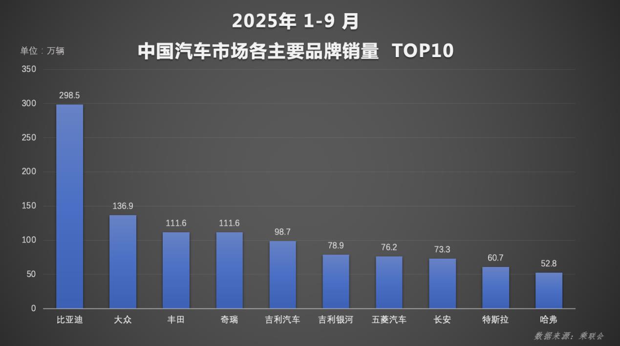 其中,比亚迪汽车(王朝丨海洋)品牌9月销量达35.6万辆,1–9月累计销量298.5万辆,在全市场单一品牌销量排名中稳居冠军,头部地位依然持续巩固。